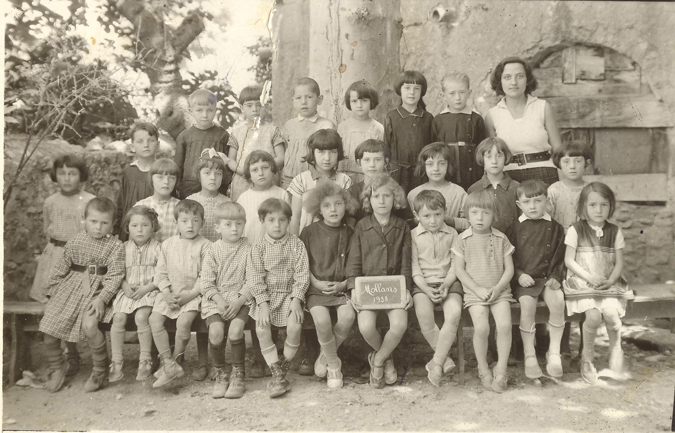 1936 Photo de toute l'école. Mme Bégou et Mr Jubic les enseignants. C'est Jeannette Flégon qui tient l'ardoise "Mollans". La photo a été prise dans la cour de l'ancienne école qui maintenant sert de salle de réunion, sous la mairie. |