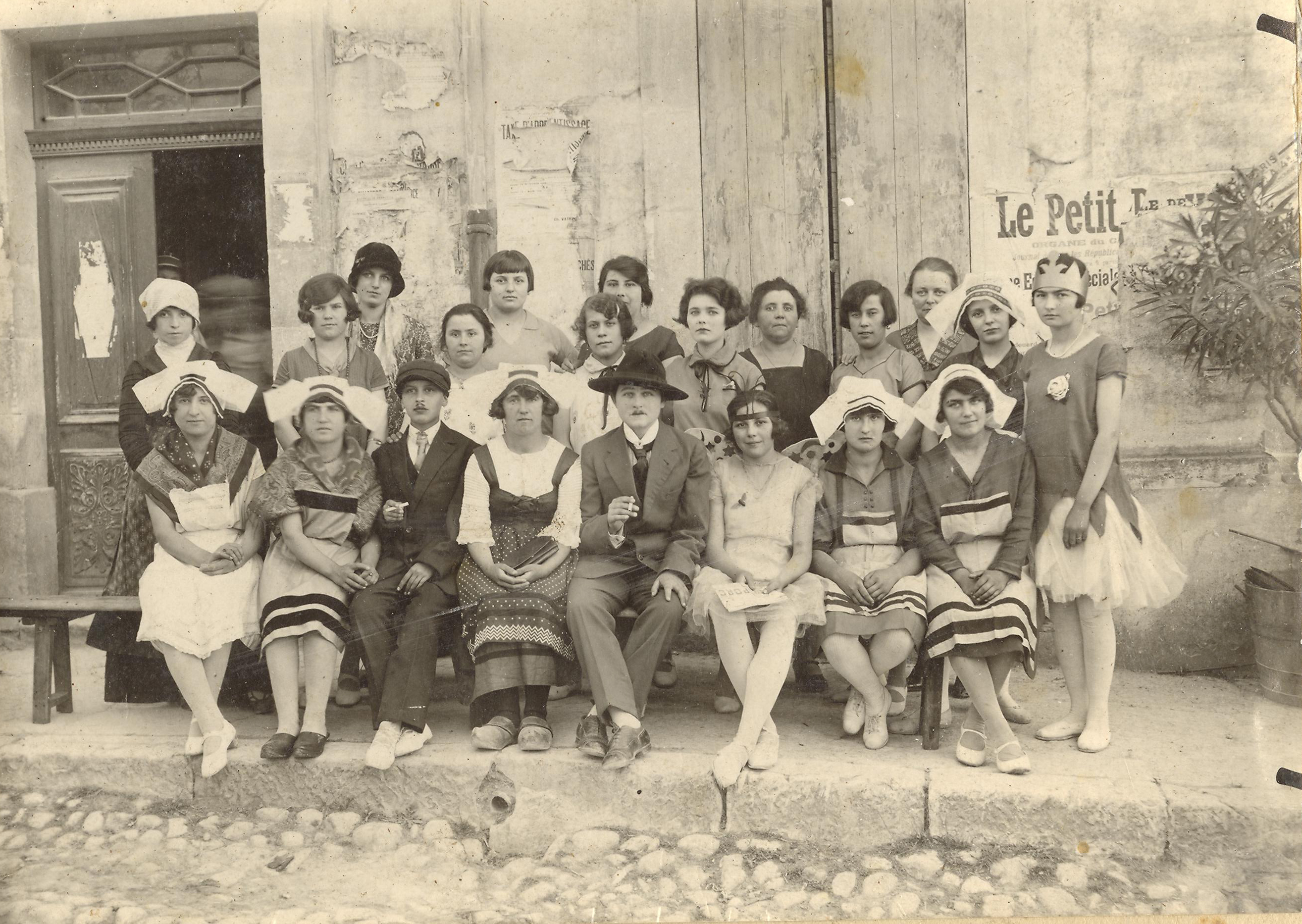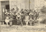 193? 7~8 La classe des filles, sûrement la classe du certificat d'étude qui s'est déguisée pour le carnaval. On reconnaît la maîtresse Mme Mouret (3ème en haut en partant de la droite). |