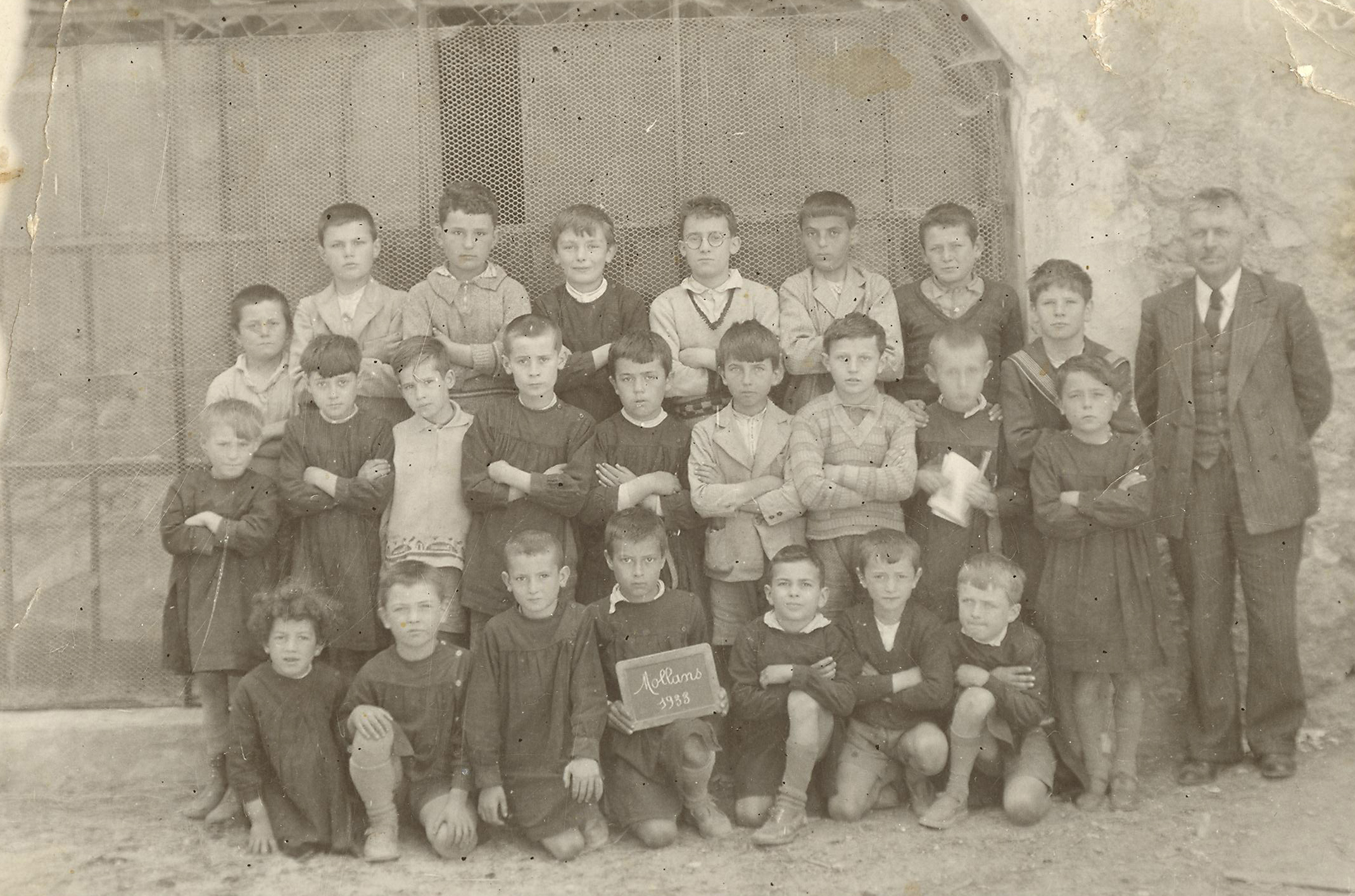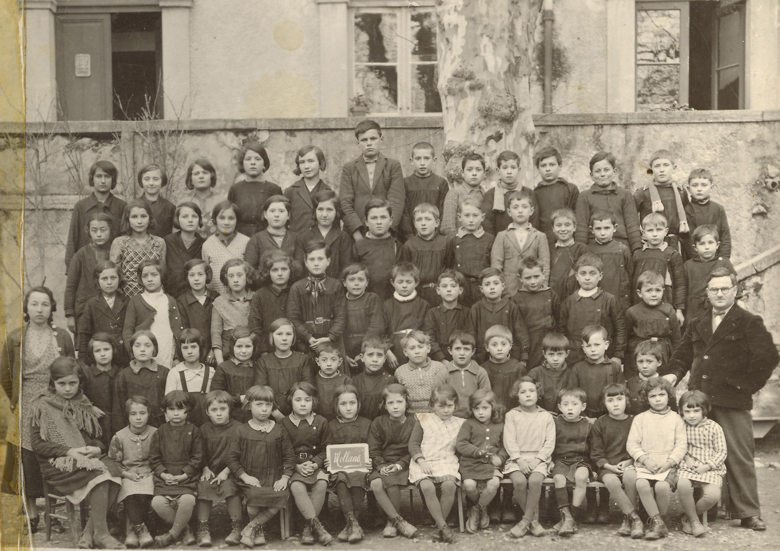 1933 - Photo de classe - On reconnaît la superbe chevelure de Camille Pantaly en bas à gauche. La photo a été prise devant la baie vitrée du moulin à huile Chauvet quand il y avait une classe, séparée de l'école sous la mairie, au-dessus du moulin. La cour existe toujours, c'est la grande terrasse qui donne sur le parking. Le WC est toujours là, il surplombait le ravin de Pisse-Rouille lequel a été recouvert pour faire le parking. |