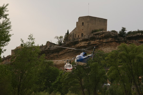 Nombreux ont été les habitants de Mollans et touristes à observer le ballet des hélicoptères de la Carte aux trésors ! Quatre engins ont survolé le village à plusieurs reprises et se sont posés au stade ou dans la rivière où un véritable héliport avait été aménagé par la mairie comme le montre les photos ci-dessous. Il s'agit du tournage de la saison 2008, l'épisode "Mollanais" passera sur France 3 le 24 juillet. |