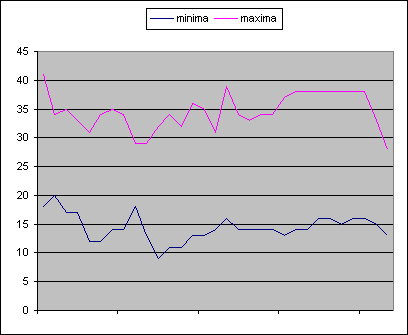 | 28/08/2001 | 16 | 38 | 5 | moyenne maxi | 34,61 | °C | ||||||